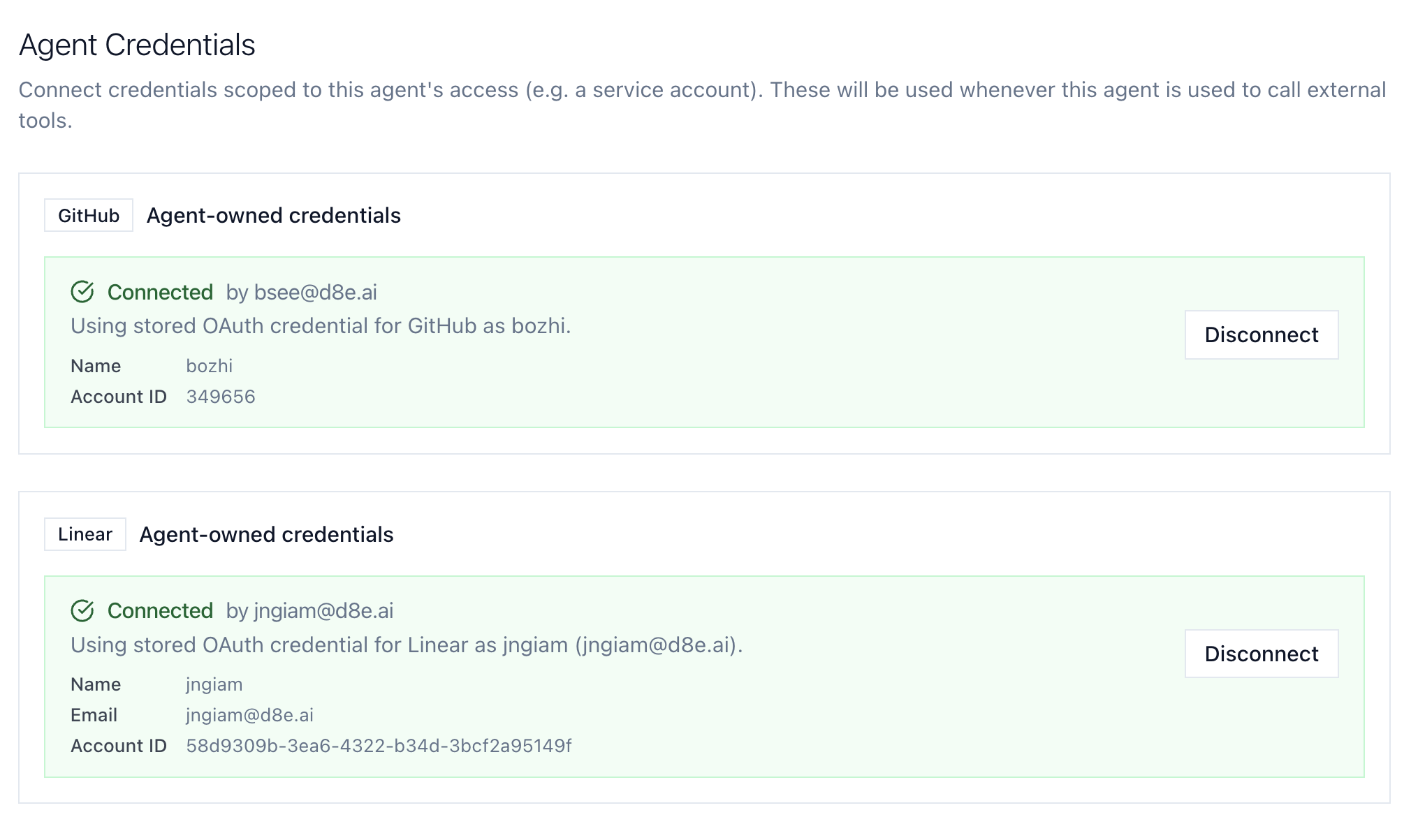 Each connection within the bundle gets its own delegated credential. Here, a single agent has GitHub access via one team member and Linear access via another, each with their own OAuth grant: