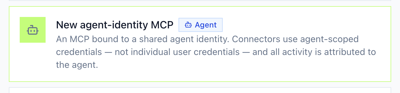 When creating an agent bundle, you select the agent-identity MCP type, which binds all connectors to the agent rather than to individual users: